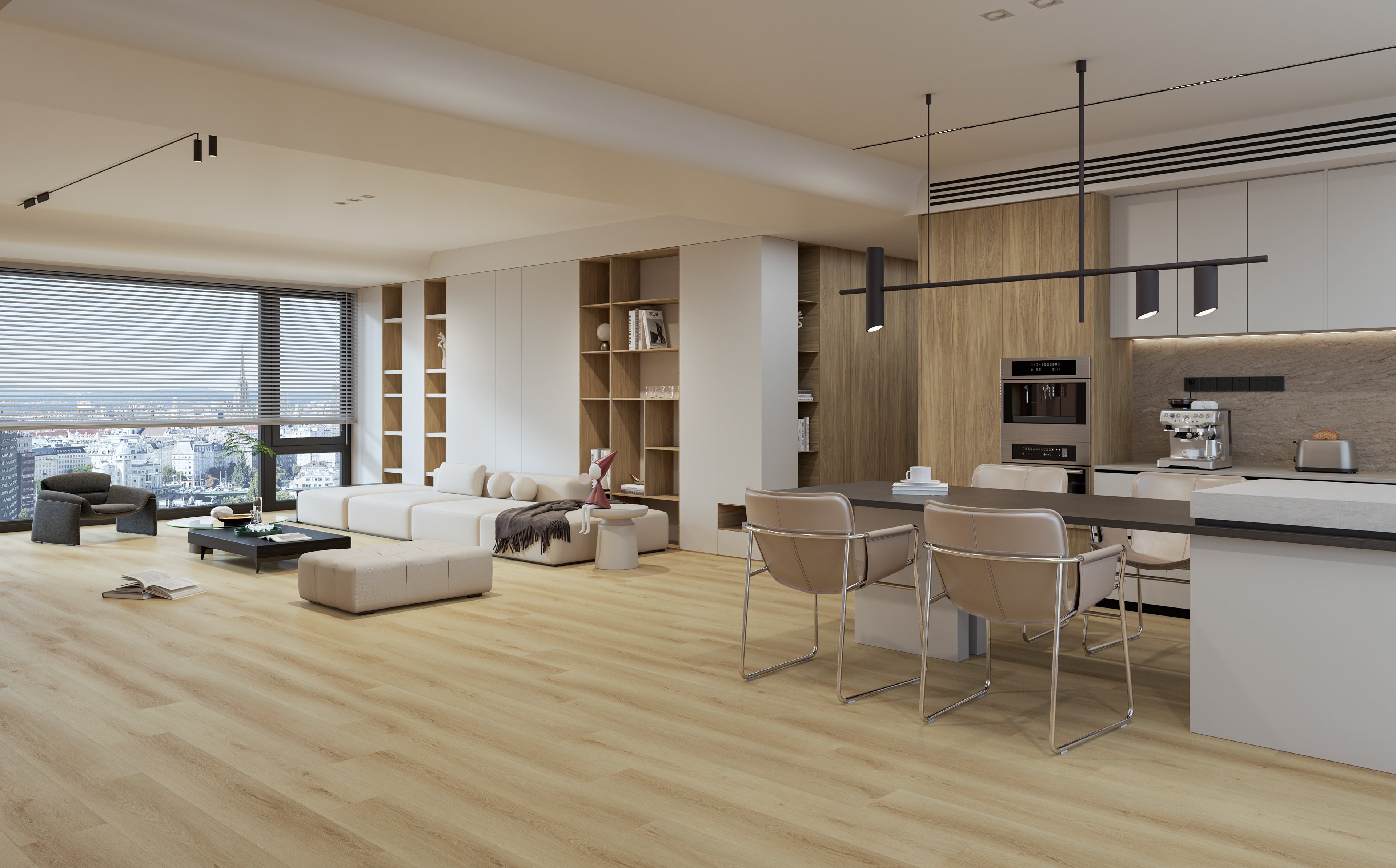 Project: Modern open-plan apartment interior visualization (kitchen + dining + living) Studio: Grafik in Fanatik This photorealistic interior render explores a calm, modern living space with a warm minimalist palette—matte light cabinetry, natural wood accents, and light oak flooring that ties the entire open-plan layout together. The goal was to create a bright, premium feel with balanced daylight, soft shadows, and realistic material response. Photoreal 3D interior rendering (daylight setup) Material & lighting look-dev (wood, stone, matte finishes, metal accents) Composition focused on spatial flow between kitchen, dining, and lounge